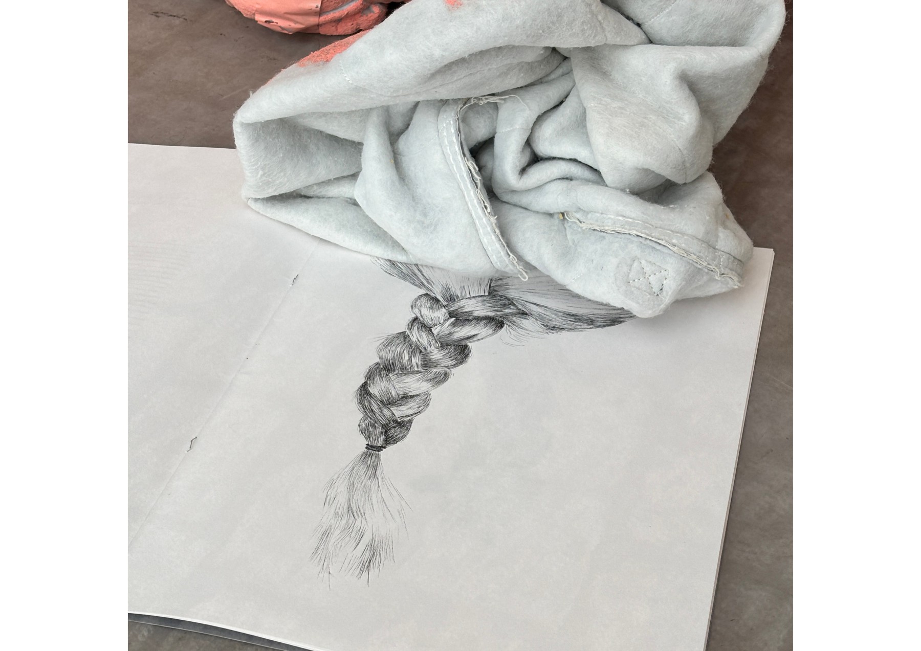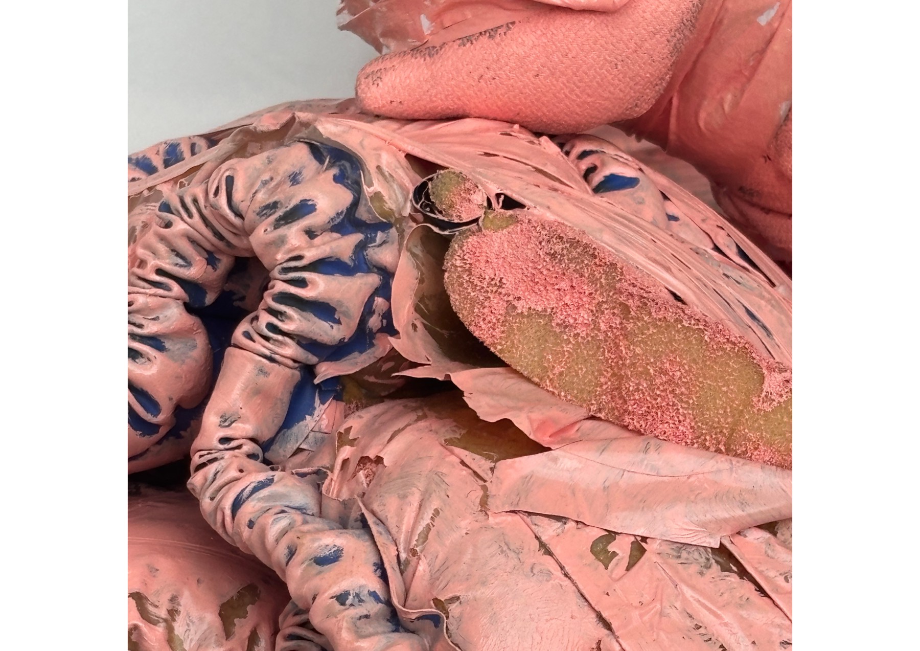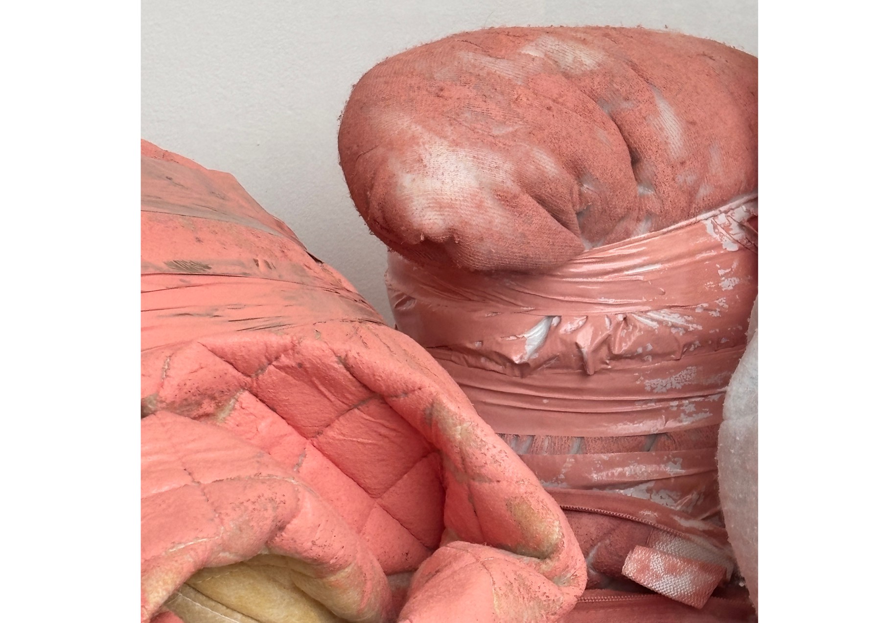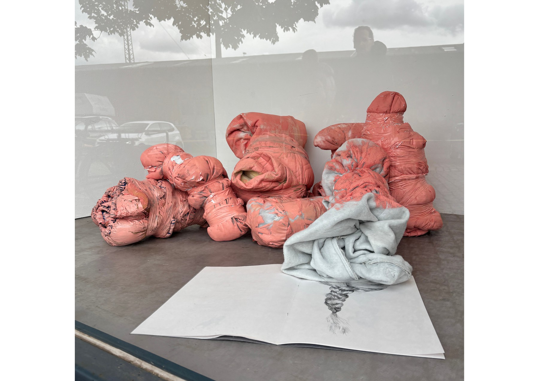 Diesen Ausdrücken folgend vermittelt die Ausstellung "Chop chop" sowohl etwas Auseinandergeschnittenes, als auch die dringliche Aufforderung, sich zu beeilen. Gezeigt werden skulpturale Elemente, die aus, auf Bremer Straßen gefundenen und zusammengeschnürten, Matratzenumhüllungen gefertigt sind. Sie sind mit fleischiger Farbe eingefärbt und postulieren auf diese Art und Weise eine Zusammengehörigkeit. Inhärent ist ihnen eine scheinbar schnelle künstlerische Umsetzung. "Husch husch!". Gleichzeitig muten die einzelnen Elemente durch ihre Farblichkeit fleischlich an. Diese Körperlichkeit wird durch die Zeichnung eines Zopfes verstärkt, der in dem Gefüge auftaucht. Körper? Teil? Teilung? Wovon?