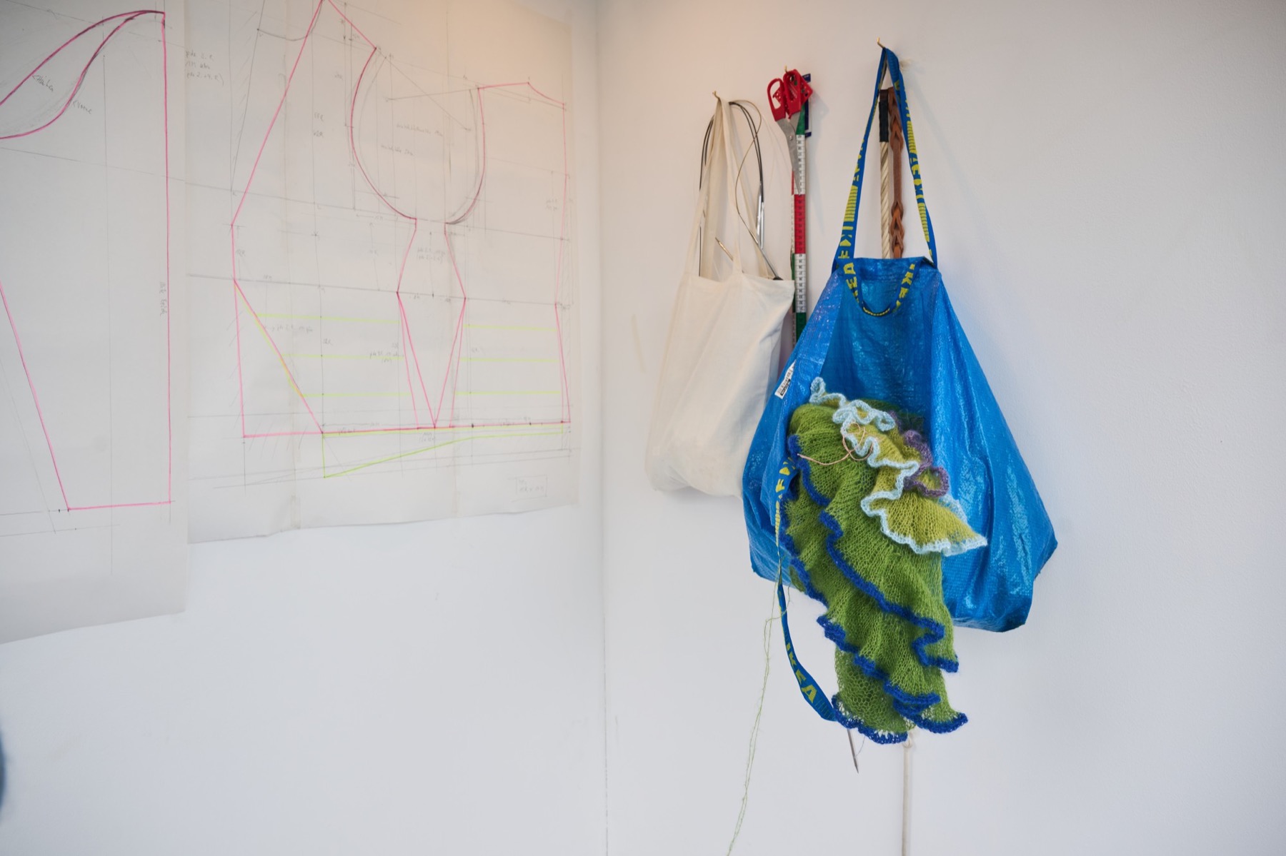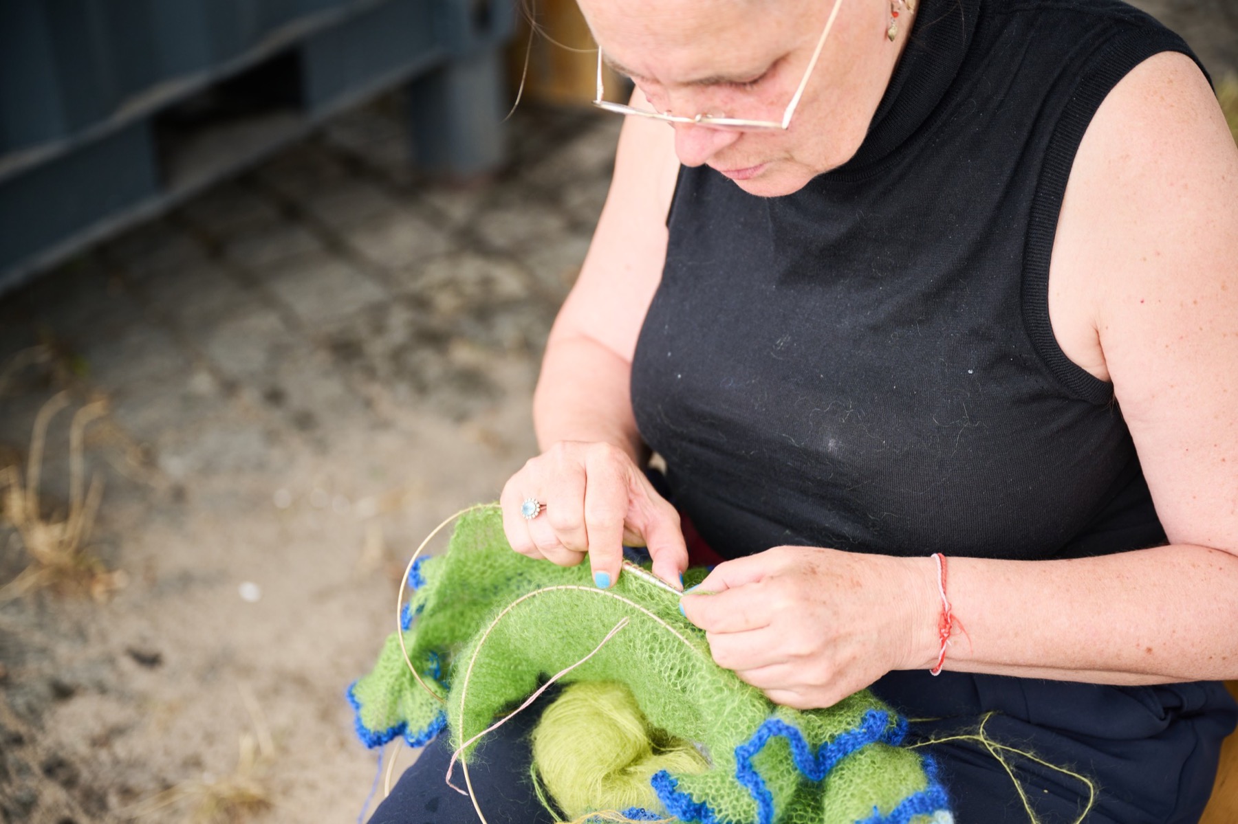Ausgehend von ihrem Material Wolle und der händischen Arbeit des Strickens, recherchiert Nana zu den mathematischen Zusammenhängen der einzelnen Maschen und dessen netzartiges Geflecht. Entgegen zu der vermeintlichen Geradlinigkeit, in der wir unsere Welt erschaffen haben, mit Gitternetzen aus Straßen, Wegen und Häuserfassaden sowie aus Rechtwinkligen Formen, wimmelt es in der Natur von geschwungenen, gekräuselten und aufeinander aufbauende Formen, die zu beweglichen, amorphen und dennoch ultra stabilen Konstruktionen führen. Diese Konstrukte werden auch als Hyperbolischer Raum bezeichnet und beschreiben die Möglichkeit, einen Punkt unendlich oft mit einer Linie zu schneiden, ohne eine weitere Linie zu kreuzen. Diesem Phänomen spürt Nana in ihren Kostümen mit der Stricknadel nach.