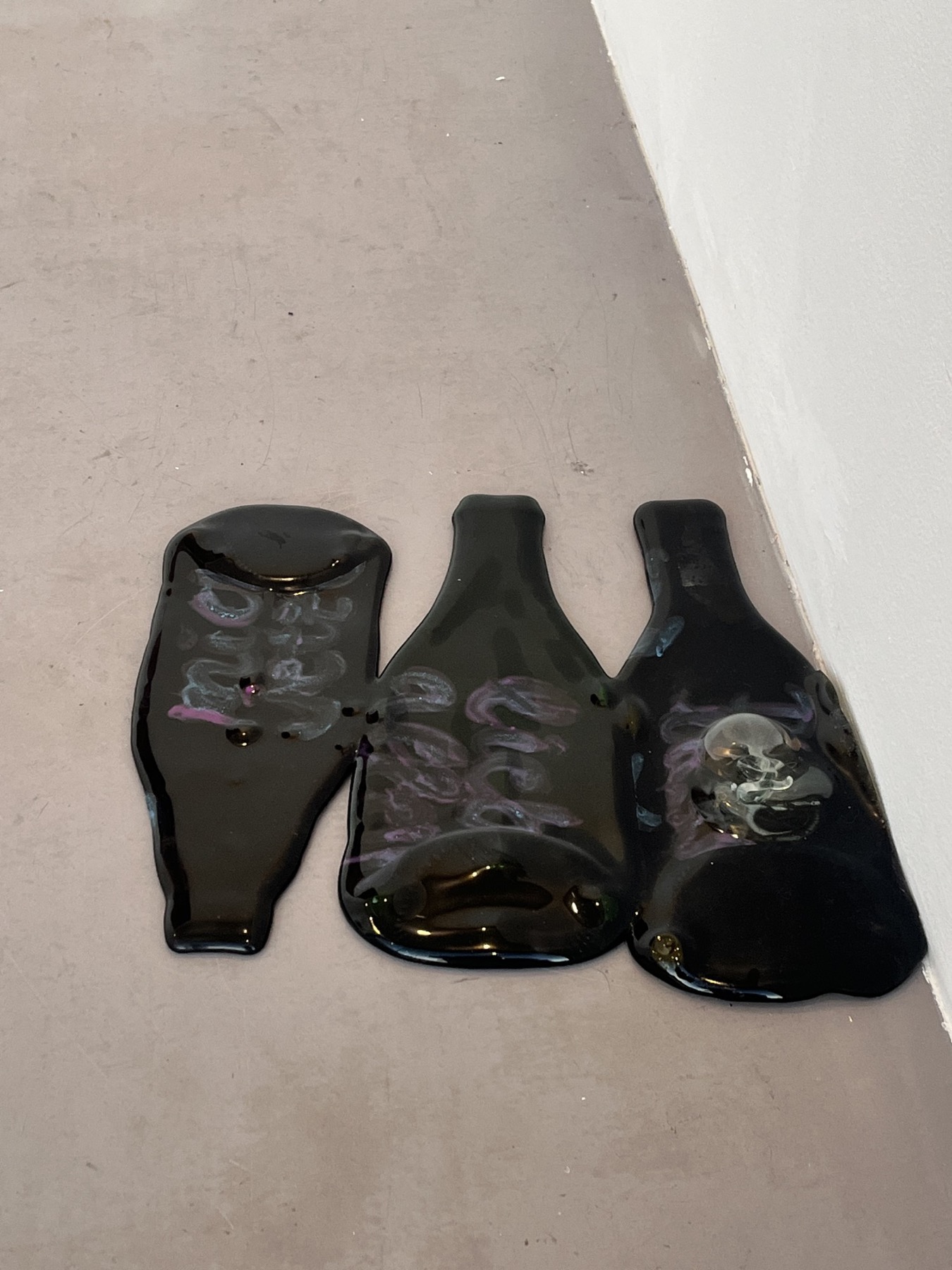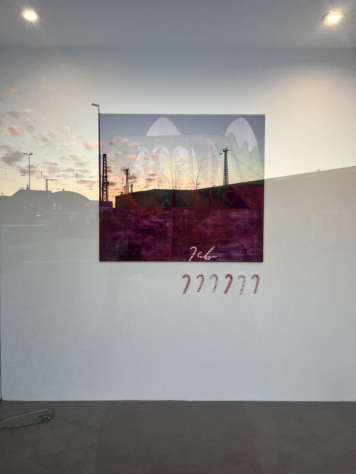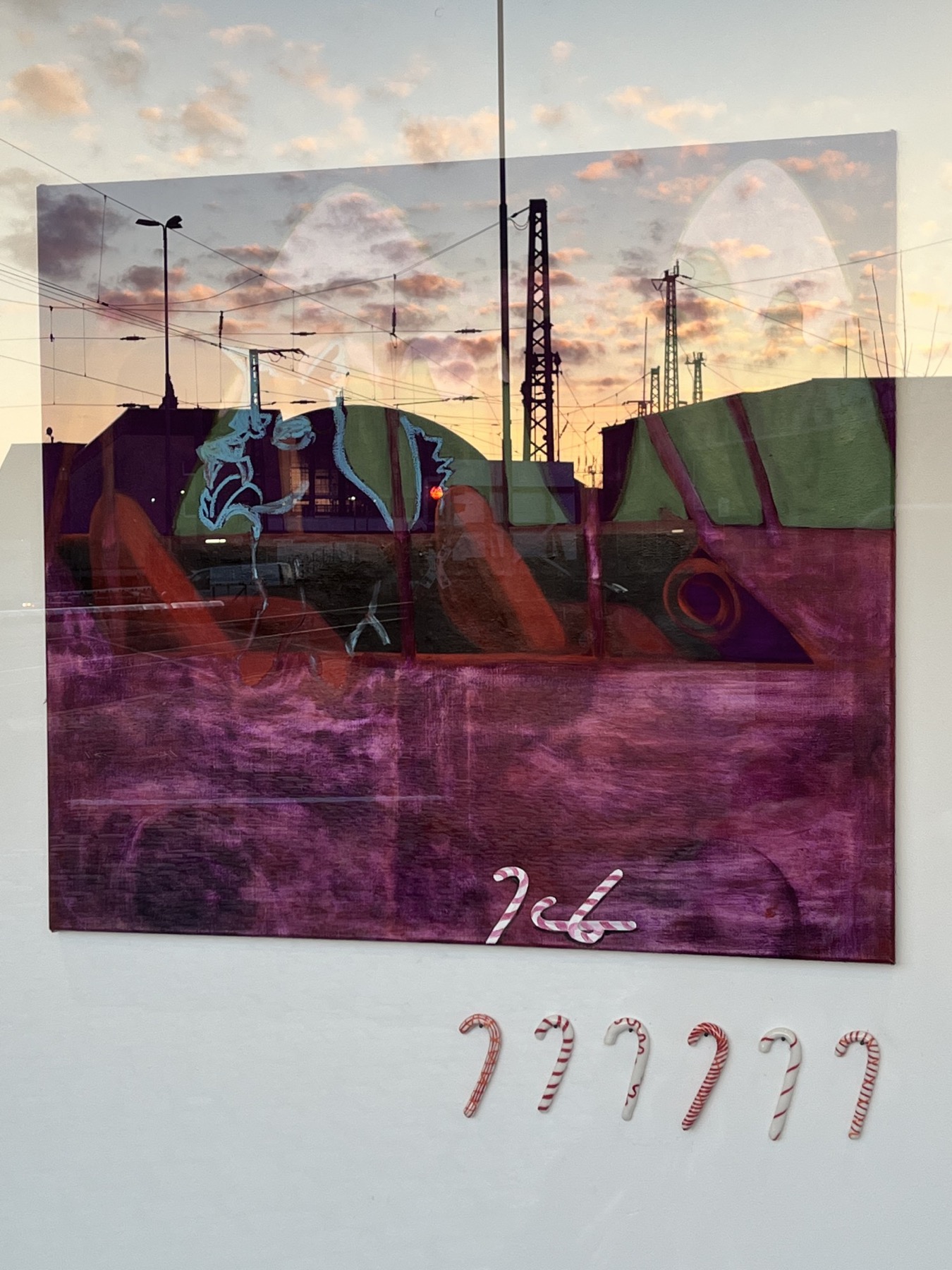 Baci (La Romantica) verbindet deutsche Sehnsüchte des dolce vita mit Spieltrieb, Realitätsverweigerung und Rausch. Mit dem Auto über die Alpen fahren und unter der Sonne Italiens frei sein, den Job bei Porsche für die 21 Urlaubstage vergessen. Sich im Hotel betrinken und am nächsten Tag dann etwas unternehmen, das auch den Kindern Spaß macht, vielleicht an den Strand gehen. Vom Dasein als Filmstar träumen und die nächste Flasche Wein entkorken. Sagen: „Ist das Wetter nicht herrlich?“ / „Ist das Wasser nicht blau?“ / „Ich leg mich erstmal in die Sonne.“ All das ist nicht mein Leben, aber fühlt sich manchmal so an. Auch ich wäre gerne Anita Ekberg. Wie diese Träume sind auch die Objekte zerbrechlich und simpel. Die leeren, flachen Flaschen sind Reste einer Konsumorgie, die Zuckerstangen wie ein Versprechen. Die Gedichte, die aus nicht verwendeten Werktiteln bestehen, behandeln ebenso Dissoziation und Eskapismus. Zusammen mit den Ölbildern ergeben sie eine Erzählung, die nur aus Fantasien besteht, aus Erinnerungen und Wünschen. Das Schlaraffenland hinter den Bergen lockt.