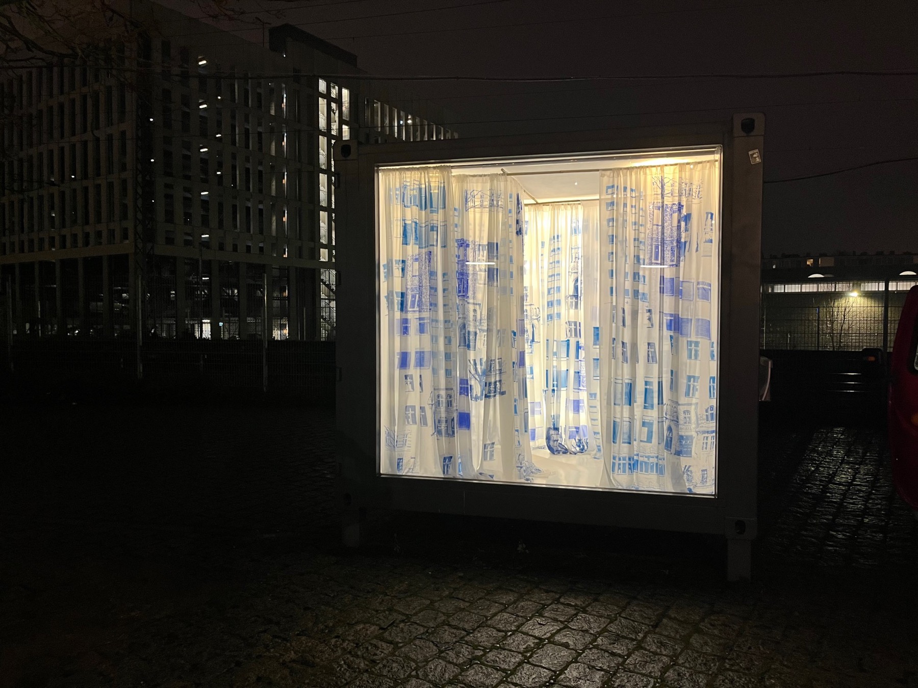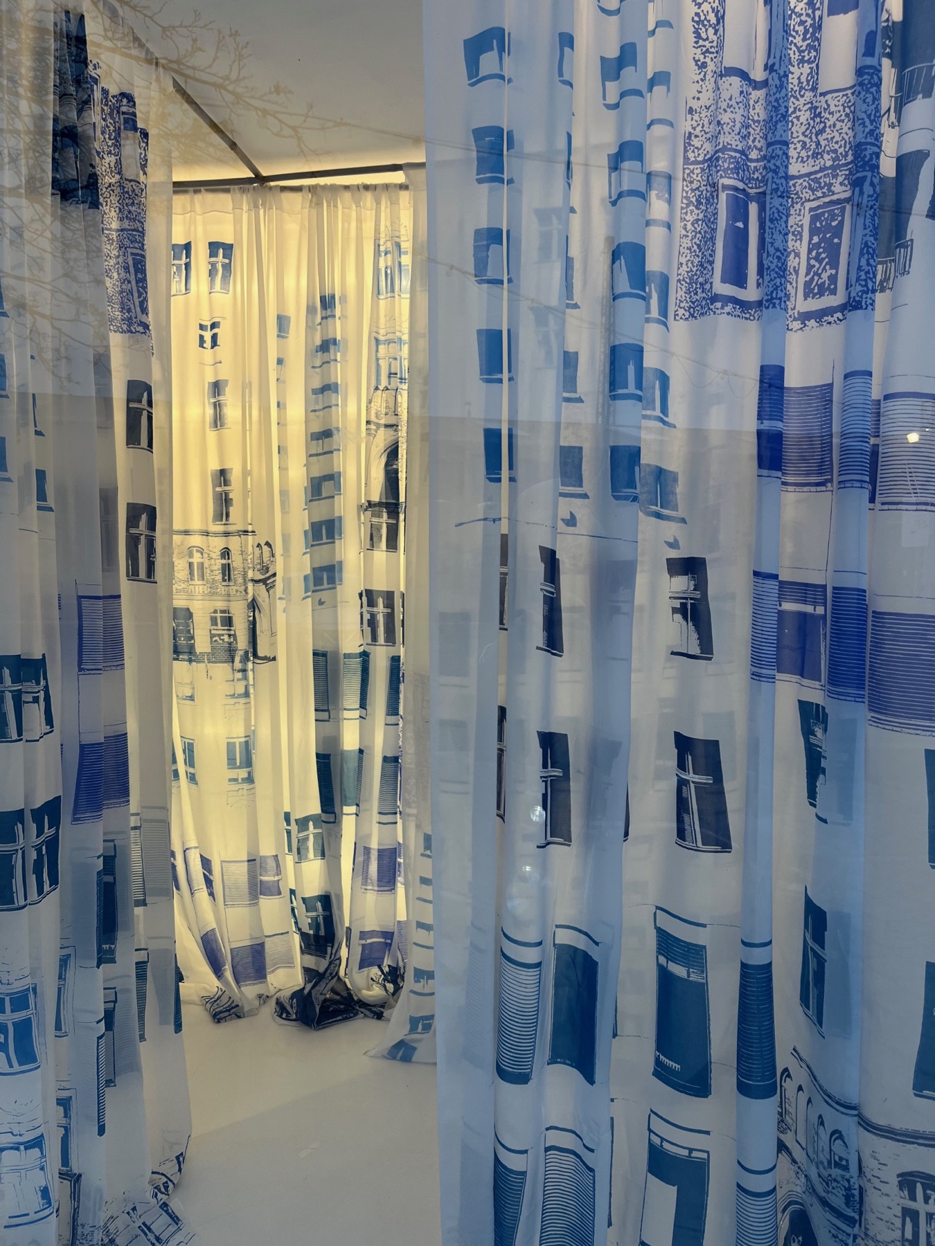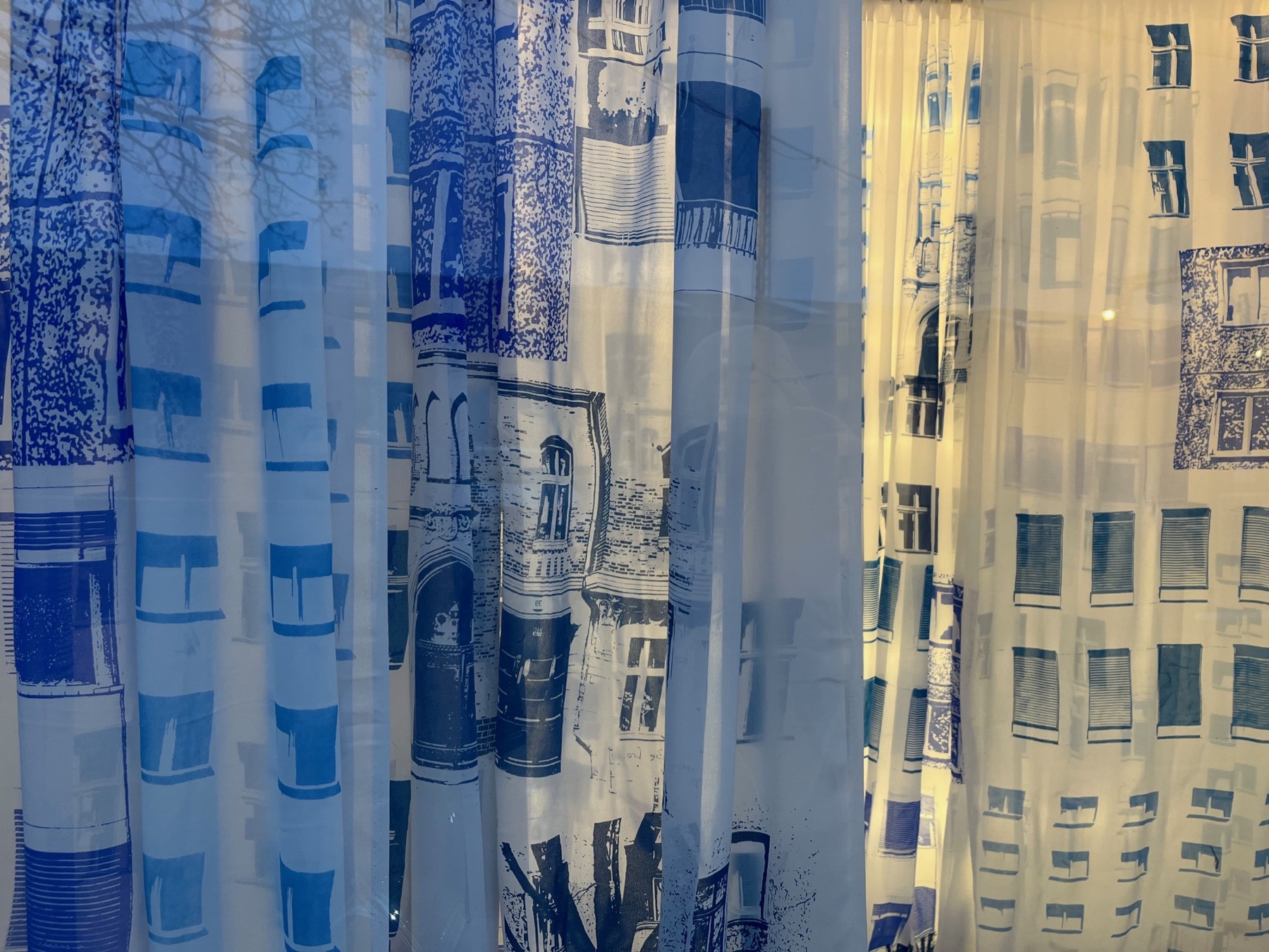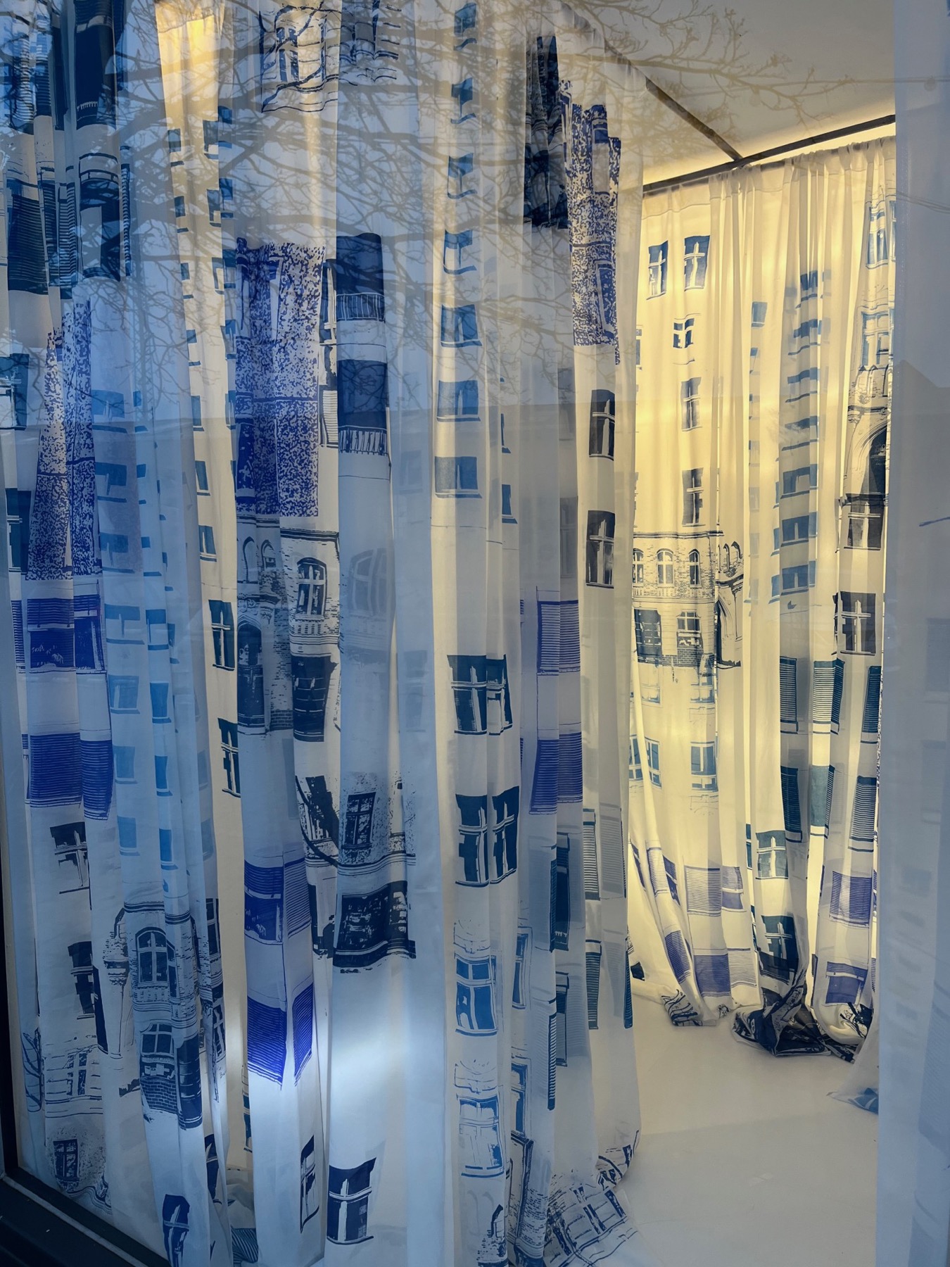 Worum geht es hier? Ist dies ein Geschäft, kann man hier etwas kaufen? Kriegt man hier Informationen? Was ist eigentlich mit dem Fenster los? Die Öffnungen in der Wand für Licht und frische Luft, verhängt mit Gardinen und Stores und Übergardinen und Vorhängen, damit keiner sehen kann, was drinnen los ist. Oder manchmal eben doch. Dann ist da ein Gestaltungswille oder ein ästhetischer Zweck oder Werbung. Oder ich stelle mich hinter die Gardine und beobachte, ohne gesehen zu werden. Die Gardine ist die Membran zwischen meiner Zelle und der Außenwelt, zwischen dem Privaten, Öffentlichen, dem Offensichtlichen und Verborgenen.