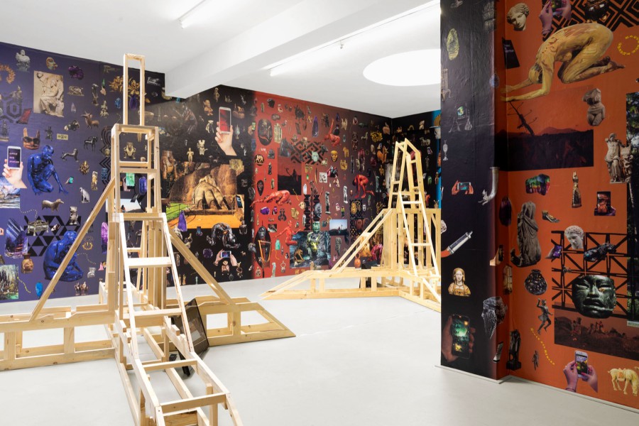 »Riten der Jugend« beschäftigt sich mit Bildern, Symbolen und Codes hypothetischer Riten, die der Jugend gewidmet sind. »If we do not initiate the youth, they´ll burn down the village just to feel the heat« sagt ein afrikanisches Sprichwort. Die Betrachter*innen werden aufgefordert die angebotenen Spuren und Hinweise in eigene Szenarien umzuwandeln. Mit diebischer Freude schleudert, puzzelt und appropriiert Jérôme Chazeix, reißt Versatzstücke aus verschiedenen Kontexten und verknüpft sie zu neuen Zusammenhängen. Dies ergibt einen popistischen, hochgradig additiven und kombinatorischen Mix, der unseren Zugang zur visuellen Kultur in einem von der digitalen Bilderflut bestimmten Zeitalter hinterfragt. Durch multimediale Erlebnisse, die Chazeix als »Gesamtkunstwerk« bezeichnet, feiert der in Berlin lebende Künstler pulsierende Parallelwelten.