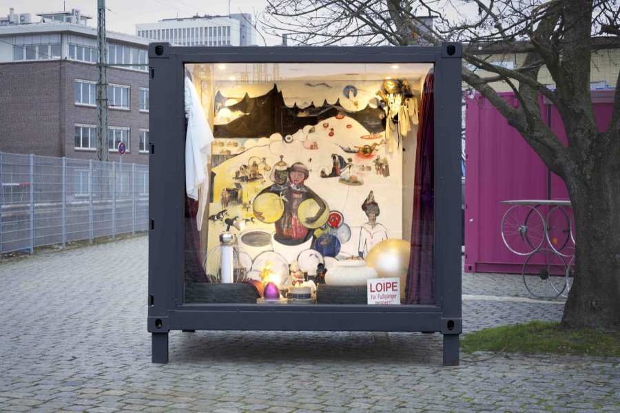 Vor dem Bild mit dem Titel ASK versammelt sie skurrile Objekte unterschiedlicher Größe. Die Kleinen halten sich nahe am Bild, als ob sie gecastet werden wollten. Die Größeren drängen sich in den Ausstellungsraum und besetzen markante Positionen. Eine Küchenuhr zieht die Blicke auf sich: Die Zeit läuft! Noch Fragen!?