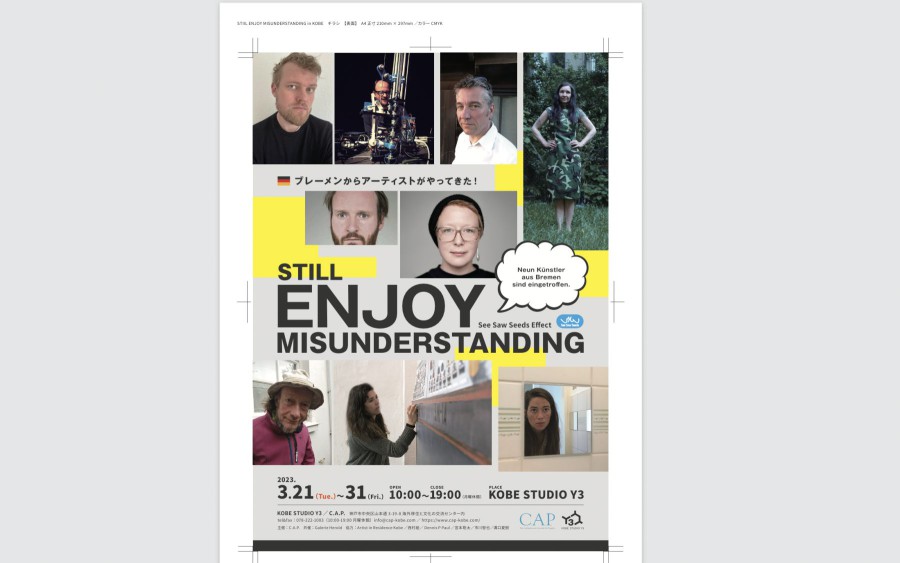 „Still Enjoy Misunderstanding“ ist eine Ausstellung im C.A.P.House in Kobe/Japan von Künster:innen der Galerie Herold (ein Projekt vom Güterbahnhof – Areal für Kunst und Kultur) aus Bremen/Deutschland. Dies ist Teil von einem Austausch, der im Sommer 2019 unter dem Titel “See Saw Seeds Effect - Enjoy Misunderstanding” begann. 6 Künstler:innen aus Kobe (Makiko Masuda, Nanako Kawaguchi, Yuta Ikehara, Yuuki Ueoka, Emily Shiell, Takeshiro Tanigawa) reisten nach Bremen, kamen bei Bremer Gastgeber:innen unter und arbeiteten für die Ausstellung in der Galerie Herold teilweise mit Künstler:innen vor Ort zusammen.