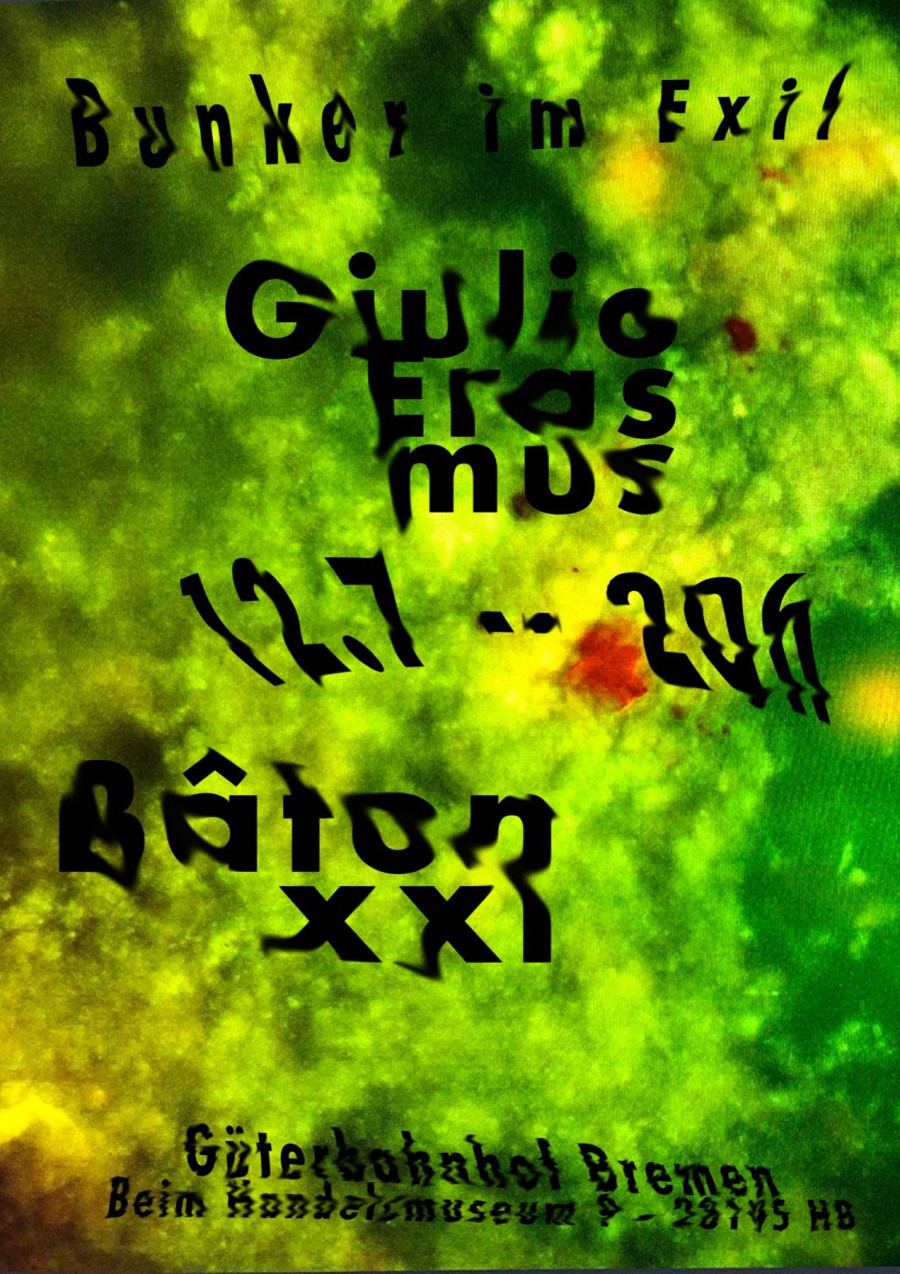 bâton XXL: amplified percussions, improved performance, retroaction, trance, voicE., Bâton XXL is a total embodiment of his unfettered energy, expressed through a modified drum kit, fizzled vocals, electronic triggers and mean ass sticks. A percussive flux to drunkenly drown in, where deranged dance rituals may follow. Giulio Erasmus: Post post 'punk'/ pre post ‘dub’ / ‘XP’ / proto fonk from Bruxhole, but a hole is not a grave. Unintelligible mutterings, songs and collapsing collages from a simpleton with simple ideas about simplicity. New record and cassette out soon.