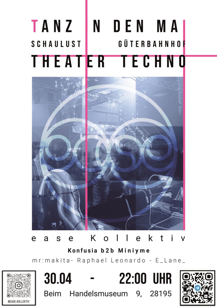 Das ease kollektiv veranstaltet seine dritte Party der Reihe TheaterTechno! Wie der Name schon sagt, wird es laute elektronische Musik geben. Dazu eine asiatisch anmutende Schwarzlicht-Dekoration, viel Nebel und eine pulsierende Beleuchtung, schon hat sich die Schaulust in einen Club der speziellen Art verwandelt. Das junge Kollektiv veranstaltet im Sommer im Rahmen des Freiluftpartygesetztes nicht-kommerzielle Veranstaltungen draußen auf öffentlichen, speziell dafür freigegebenen Flächen. Dazwischen haben sie in der Schaulust einen Ort gefunden, der offen ist für diese spezielle Form der elektronischen Kunst. Die Reihe TheaterTechno ist eine Fusion des Ortes, des Theaters und einer Subkultur, die sonst in industriellen Hallen oder Clubs zu Hause ist. Das Holz und die Wärme der Schaulust treffen auf gestochen scharfe, nahezu kühle elektronische Klänge. So kommt es zu einem ganz speziellen Erlebnis, wenn es wieder heißt: TheaterTechno in der Schaulust!
