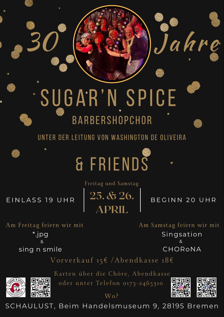 Seit 30 Jahren sind „Sugar‘n Spice“ nach wie vor der einzige Frauen-Barbershop-Chor in Bremen und im Norden Deutschlands! Inspiriert vom damals noch reinen Männer-Barbershop-Chor „Singsation“ (s.u.) wollten auch sie in diesen besonderen Septime-Akkorden (=Barbershop-Klängen) „baden“ und ein Teil der Barbershop-Familie (BinG!) sein. In den mittlerweile 14 ahren unter der Leitung des brasilianischen Chorleiters Washington de Oliveira, der den Chor mit der Leidenschaft Südamerikas, viel Geduld und Esprit durch die Klangwelten des Barbershop führt, ist eine stetige, sicht- und unüberhörbare Entwicklung eingetreten – so wurden hier im Hause u.a. zwei Shows auf die Bühne gebracht und für dieses Jahr ist erfreulicherweise schon eine neue in Planung, ebenfalls hier- uraufgeführt wird. Somit gibt es VIELE GUTE GRÜNDE ZUM FEIERN und Sugar‘n Spice lädt ein zu zwei Jubiläums-Konzerten mit Freundinnen/Freunden und Wegbegleitern.