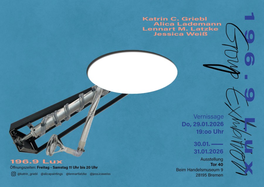 In der Gruppenausstellung „196.9 Lux" begegnen sich vier künstlerische Positionen in einer Zusammenstellung aus Malereien, Objekten, Fotografien und Videoarbeiten. Aus unterschiedlichen künstlerischen Ansätze entsteht ein dynamisches Geflecht aus Bewegung und Ruhe, Licht und Schatten, Klarheit und Diffusion. Der Mittelwert der Lichtmenge im Ausstellungsraum führt die verschiedenen Haltungen der Werkschaffenden zusammen. Die Ausstellung wird so zu einem Resonanzraum von Gefühlen, Wahrnehmungen und gesellschaftlichen Spannungen - ein Ort, an dem sich individuelle Ausdrucksformen zu einem gemeinsamen Erfahrungsfeld verweben.