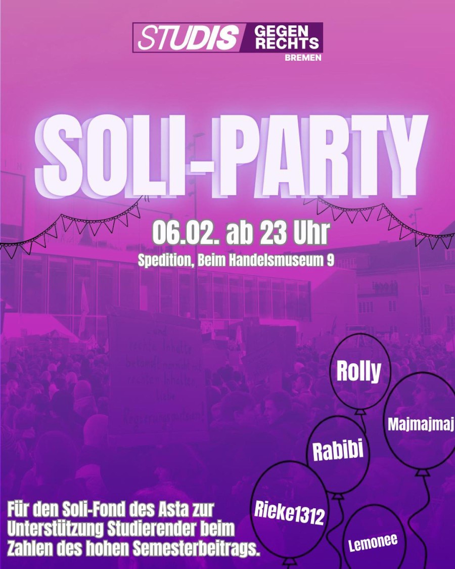 Das ist unzumutbar! Deshalb hat der AStA Uni Bremen einen Soli-Fond eingerichtet, um Betroffene finanziell zu unterstützen. Alle Einnahmen der Party werden an diesen Soli-Fond gespendet.