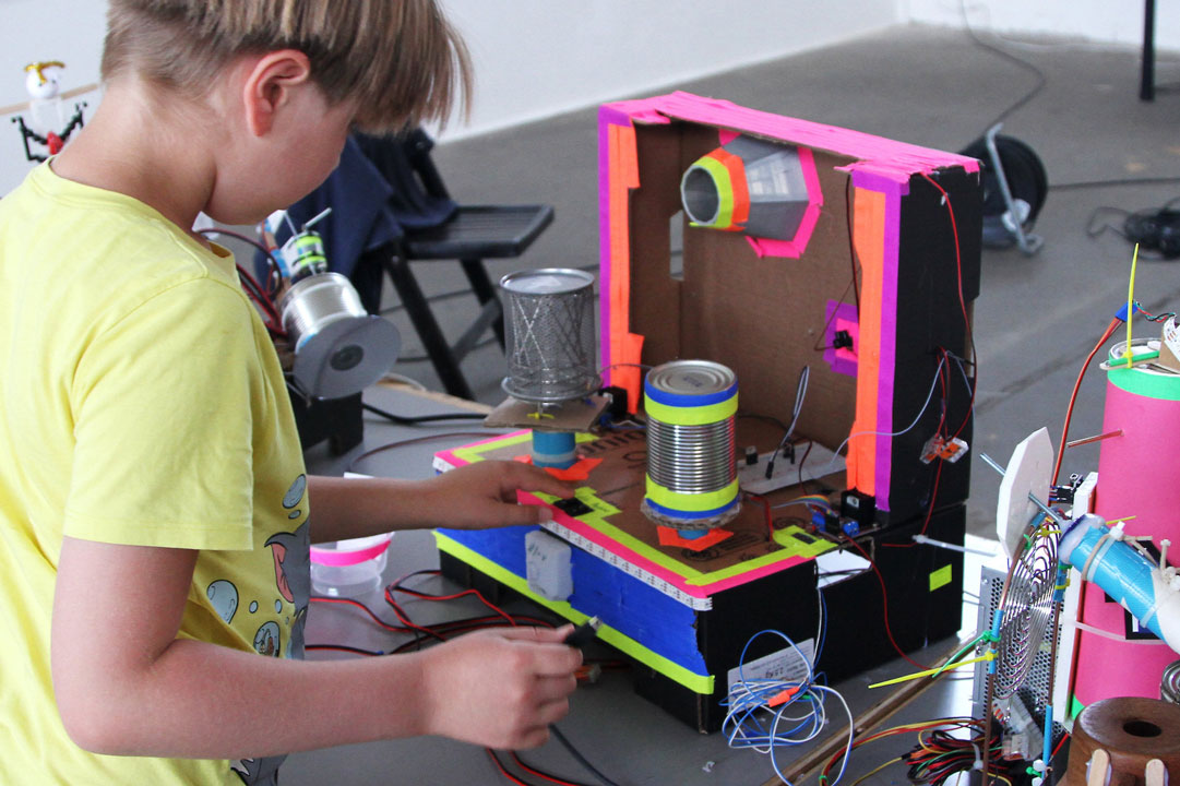 Du hast Lust eine Maschine zu bauen, die Klänge und Geräusche produziert? Dann komm in die Soundmaschinen-Werkstatt! Wir bauen Maschinen aus Alltagsgegenständen. Bringe dafür altes Spielzeug, leere Dosen, Weihnachtsdeko, Pappe und alles mit, was dir einfällt. Diese Dinge erwecken wir zum Leben, indem wir sie mit Motoren, elektrischen Schaltungen und Mikrokontrollern verbinden, so dass sie Geräusche erzeugen.Wir finden interessante Klänge, experimentieren mit Material und Technik, Rhythmus und Programmierung. Am Ende der Werkstattwoche gibt es eine Ausstellung und Konzert mit unseren Maschinen!