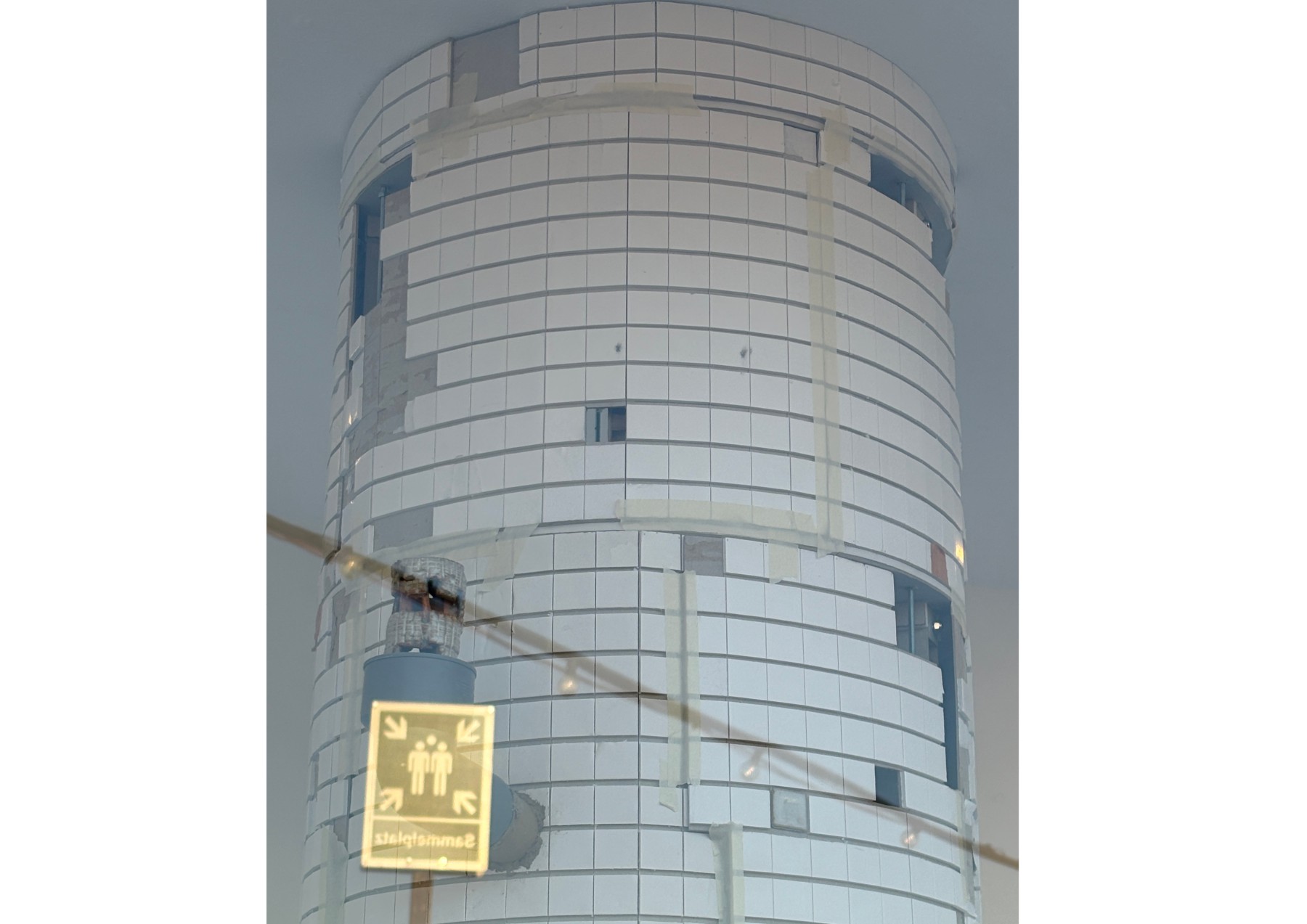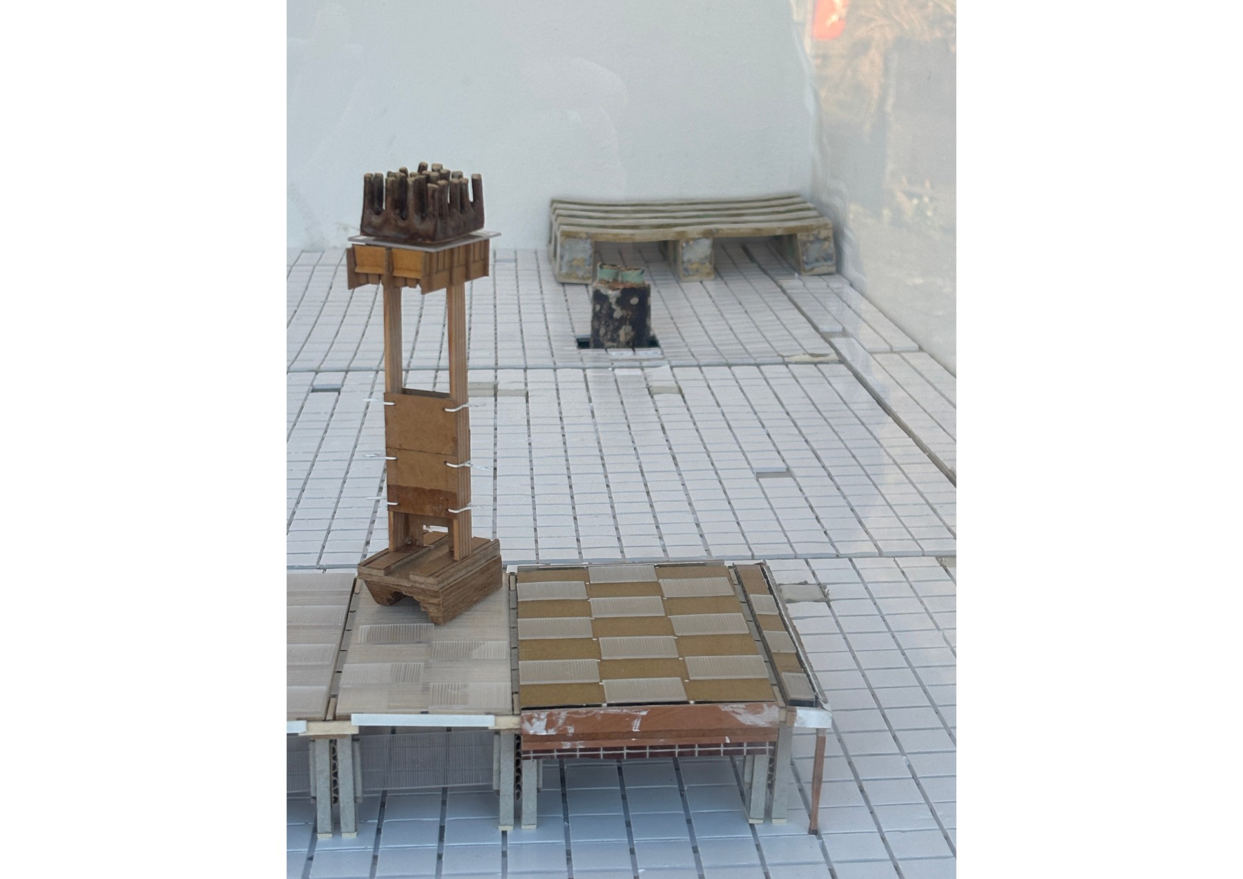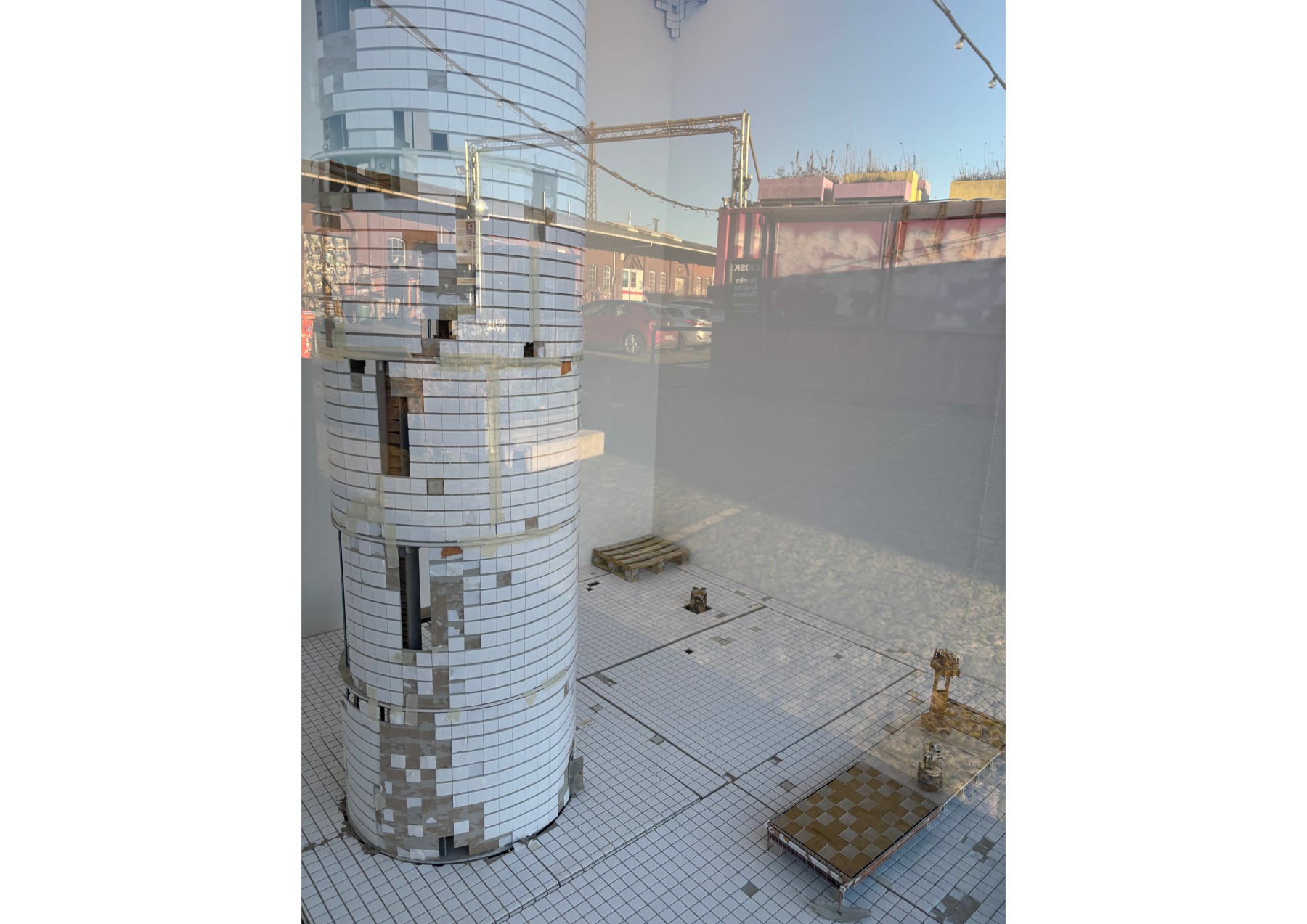 Im Prozess der Re-Übersetzung bisheriger Installationen entstehen im Modellraum Risse, Idealisierungen und Maßstabswechsel. Die keramischen Objekte vergrößern sich zu monumentalen Formen, die abgestreifte Hülle einer Säule wächst zu einem Turm heran, und auch der Container selbst weitet sich zu einem großen White Cube aus.