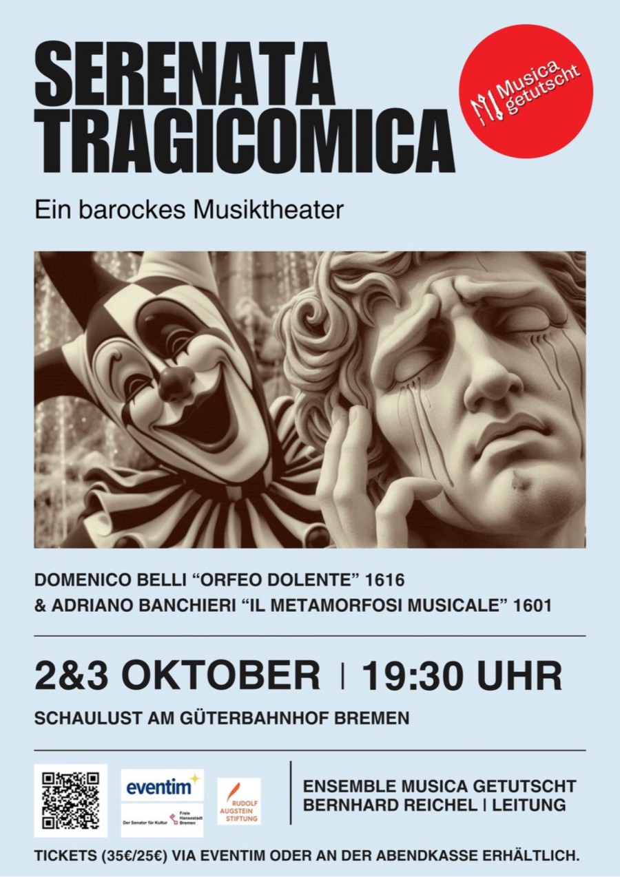 In der Serenata tragicomica führt das Ensemble „Musica getutscht“ unter der Leitung von Bernhard Reichel Banchieris Madrigalkomödie „Il Metamorfosi Musicale“ verbunden mit Domenico Bellis Mini-Oper „Orfeo dolente“ in einem kurzweiligen musiktheatralischen Abend in der Bremer Schaulust auf. Gemeinsam mit vier Schauspieler*innen und der Opernregisseurin Ana Cuéllar Velasco werden die beiden frühbarocken Meisterwerke bunt und gegenwartsnah in Szene gesetzt!